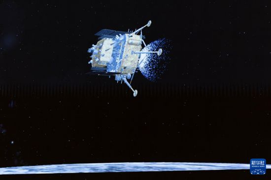 这是6月2日在北京航天飞行控制中心屏幕上拍摄的嫦娥六号着陆器和上升器组合体着陆月背的模拟动画画面。新华社记者金立旺摄