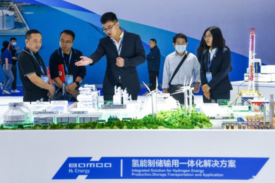 11月23日,观众在中国石油展台了解氢能制储输用一体化解决方案。(新华社记者 梁旭 摄)